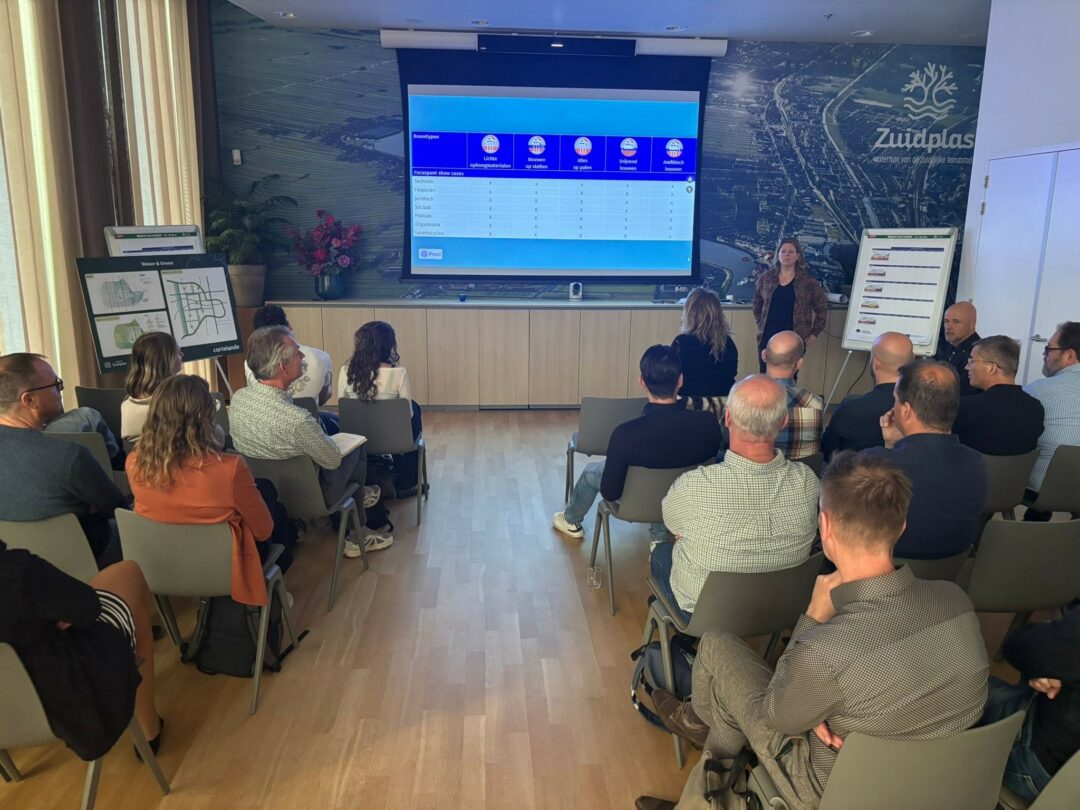 De aftrap van de showcases en innovatieve pilots werd gegeven door Rienske Zegwaard. Prachtig beeldmateriaal ontwikkeld door Manfred van Eijk van Viverra Films werd getoond en Saskia Hommes- Slag van Waterprof verbinders in water, klimaat en energie gaf een toelichting hoe we inhoudelijke informatie als inspiratiecases voor en door de gebieden verder willen verzamelen en ontsluiten. Genodigden gingen hier gelijk actief mee aan de slag door te komen met inspirerende casussen. Naast aandacht voor de nieuw te bouwen woningen werd er nadrukkelijk aandacht gevraagd voor de aanleg en beheeropgave van de openbare ruimten.